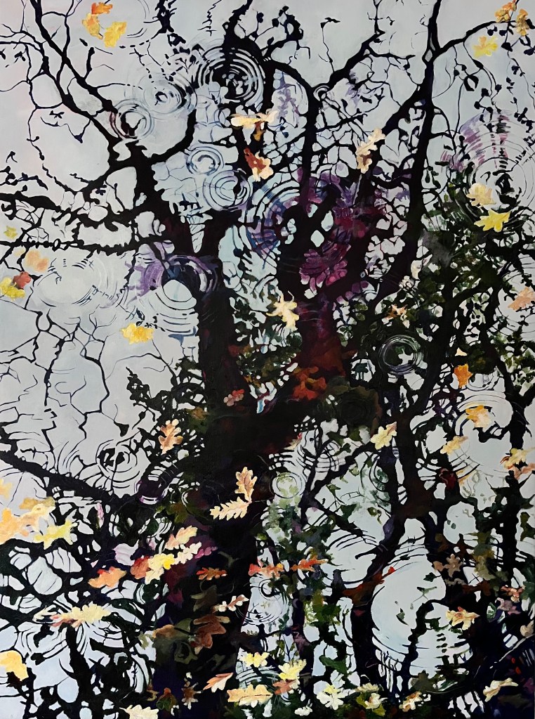 I came across this reflection on a walk in autumn. I was transfixed by the colours and shapes. The bare branches reaching towards the sky, the tree no longer clothed in its beautifully shaped leaves. The rain continued to pour and created ripples further distorting the shapes, gold sang out and moved amongst the reflections as the last of the oaks leaves fell almost reclothing the tree in a brighter richer colour.